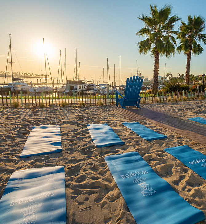 Relax at the largest man-made beach in Long Beach, "Playa at the Maya." The 6,500-square-feet resort-style, urban beach features 285 tons of real sand, two 4-feet diameter fire pits, colorful umbrellas, comfortable chaise lounges and cozy day bed.